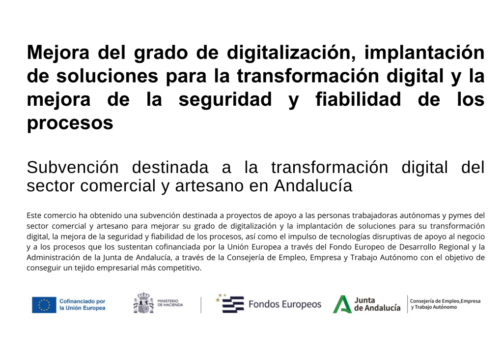 Este proyecto ha sido beneficiario del Fondo Europeo de Desarrollo Regional cuyo objetivo es mejorar el uso y la calidad de las tecnologías de la información y de las comunicaciones y el acceso a las mismas y gracias al que ha desarrollado la implantación de Presencia web a través de página propia para la mejora de la competitividad y productividad de la empresa.